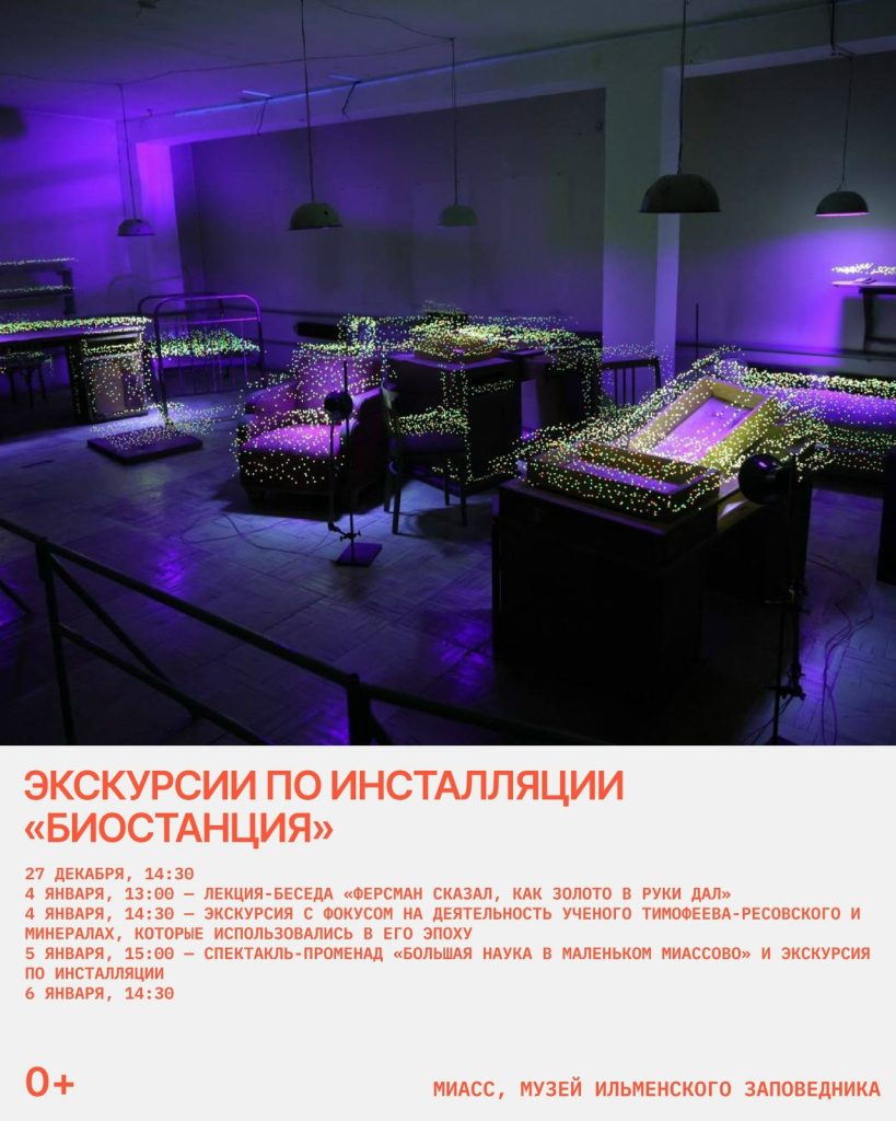 • 5 января в 15:00 — спектакль-променад «Большая наука в маленьком Миассово» и экскурсия по инсталляции «Биостанция»