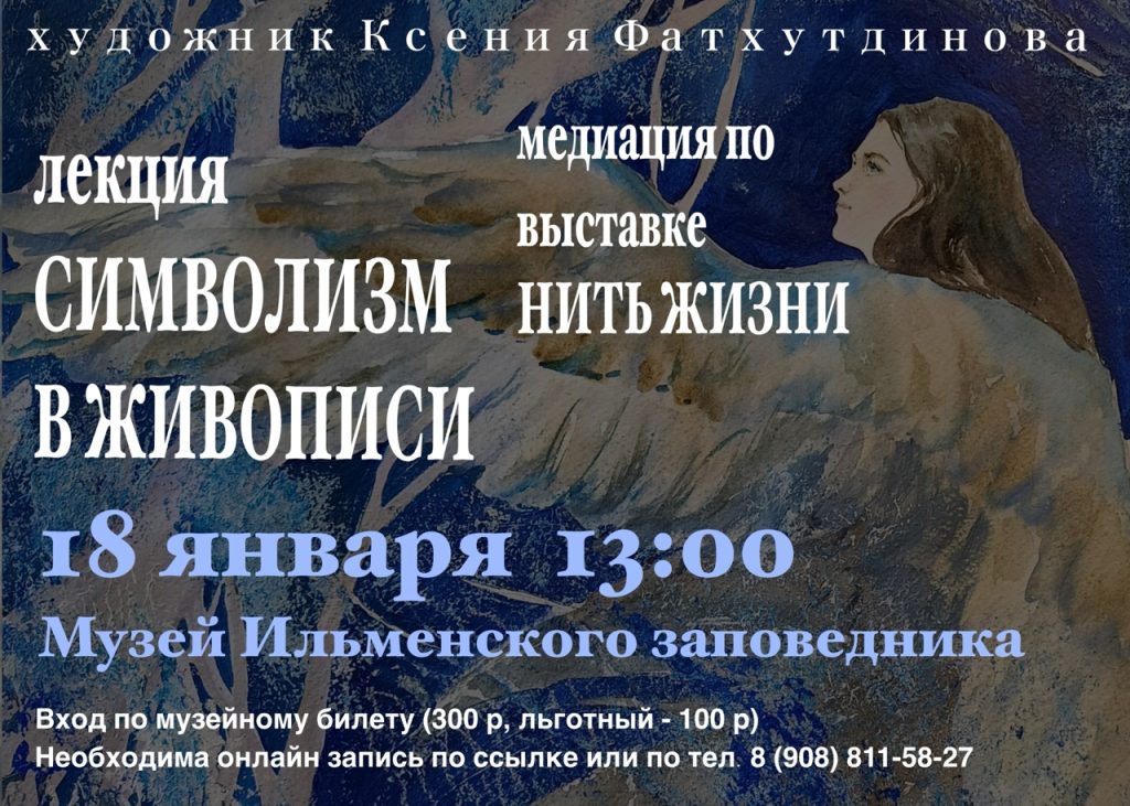 В воскресенье, 18 января, в Музее Ильменского заповедника состоится лекция о символизме в живописи. Лекцию будет читать Ксения Фатхутдинова, талантливый художник, педагог, чья выставка «Нить жизни» представлена в одном из залов нашего музея. После лекции Ксения проведёт медиацию по своей выставке «Нить жизни», на которой расскажет о своих собственных символах и смыслах на примере своих картин.